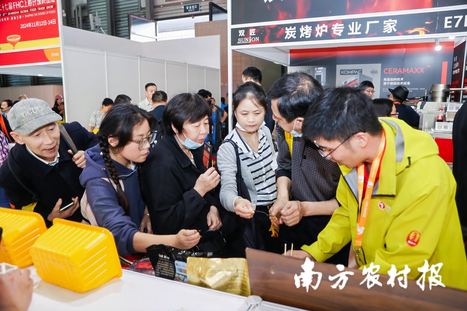 11月12-14日,第二十七届FHC上海环球食品展在上海举办。展会进入最后一天,清远鸡的展位上依然人头攒动。现场试吃清远鸡汤、清远鸡煲,吸引了逛展的观众、游客驻足排队品尝。